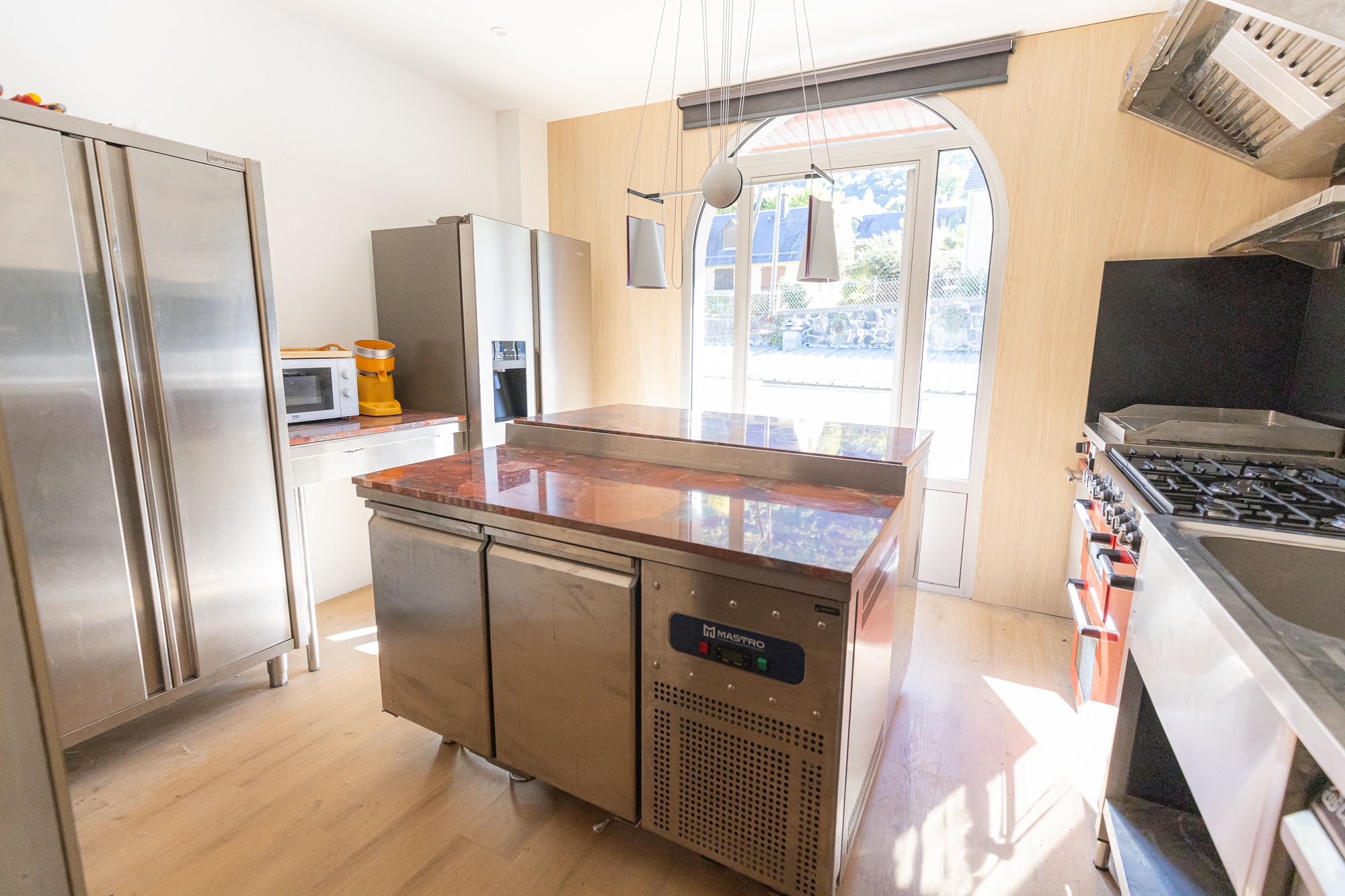 Cuisine conçue professionnellement afin de répondre aux grands nombres de voyageurs. Cuisiène SMEG 5 feux gaz + 3 fours. Hotte aspirante inox éclairante. Grill au chrome grande capacité. Plonge inox grand évier. Machine à laver professionnelle grande capacité. Amoires réfrigére positive et négative avec plaque en marbre. Frigo américain, distributeur de glaçons et eau fraîche. Armoire de rangement en inox. Batterie de cuisine avec tous les accessoires, presse fruits et tout le nécessaires.