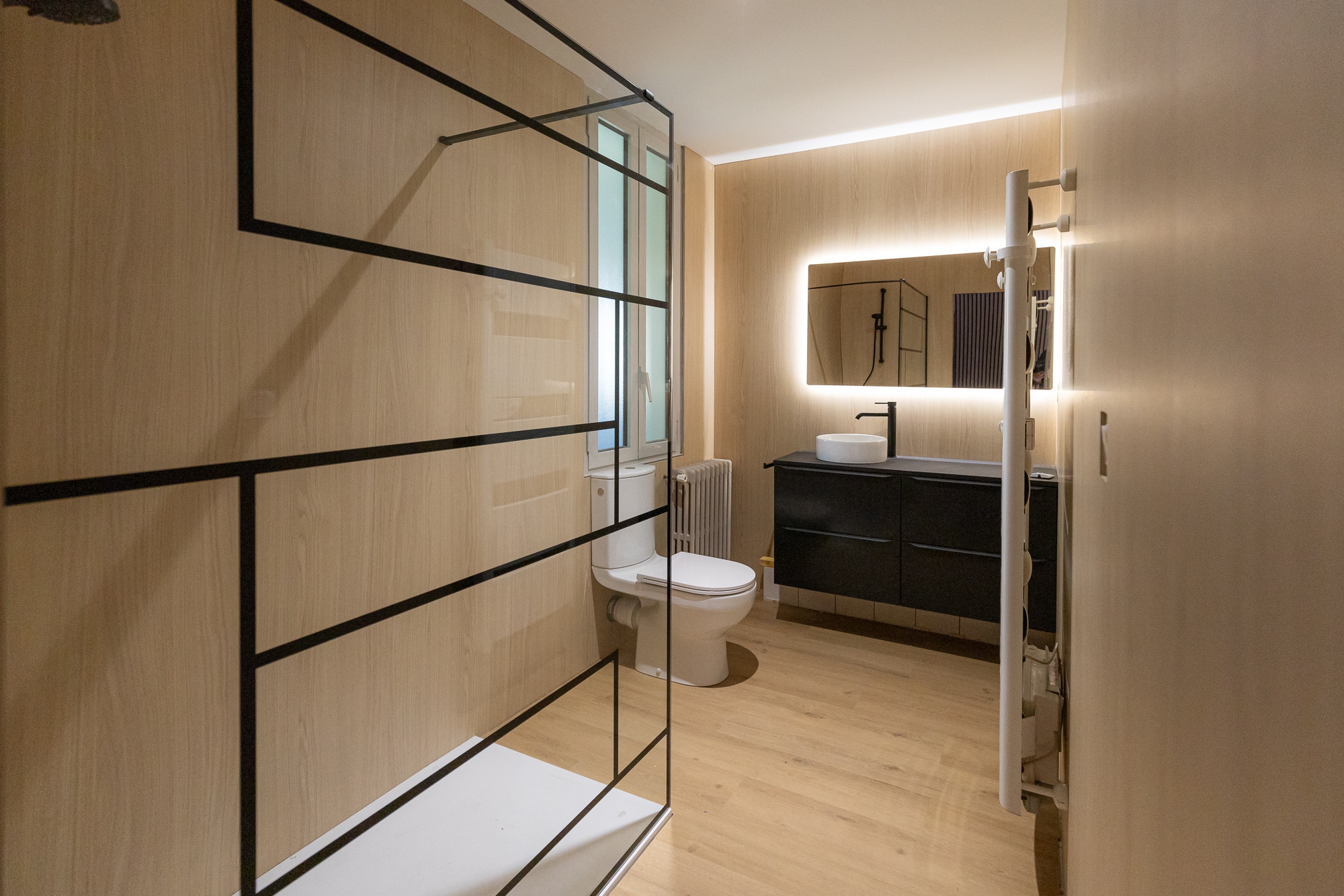 Salle de bain avec douche à l’italienne, meuble et vasque, WC, sèche serviettes.